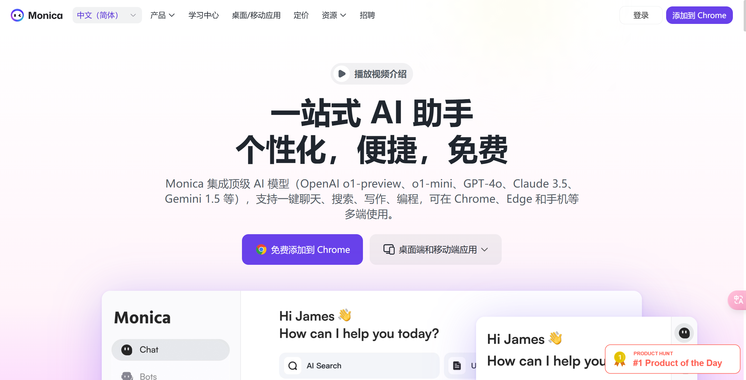 Monica AI 是您的多功能 ChatGPT AI 助手,提供广泛的高级 AI 模型来支持聊天、搜索、撰写、翻译等任务。借助 Monica,您可以通过 AI Chat、AI Summary、AI Writer、AI Search、AI Translator 和 AI ArtBot Platform 等功能有效地节省时间和提高生产力。平台汇集了多种 AI 模型,能即时总结网页和视频,快速改进内容,并翻译网页以增强双语阅读体验。无论您是专业人士、企业家、研究人员、开发人员还是营销人员,Monica AI 都能为您提供量身定制的解决方案,满足您的特定需求。从 AI 市场情报到 AI 电子邮件助手和 AI 编程助手,Monica AI 为用户提供了智能工具,简化任务并提高效率。体验 Monica AI 的强大 AI 功能,解锁日常工作流程中的新可能性。